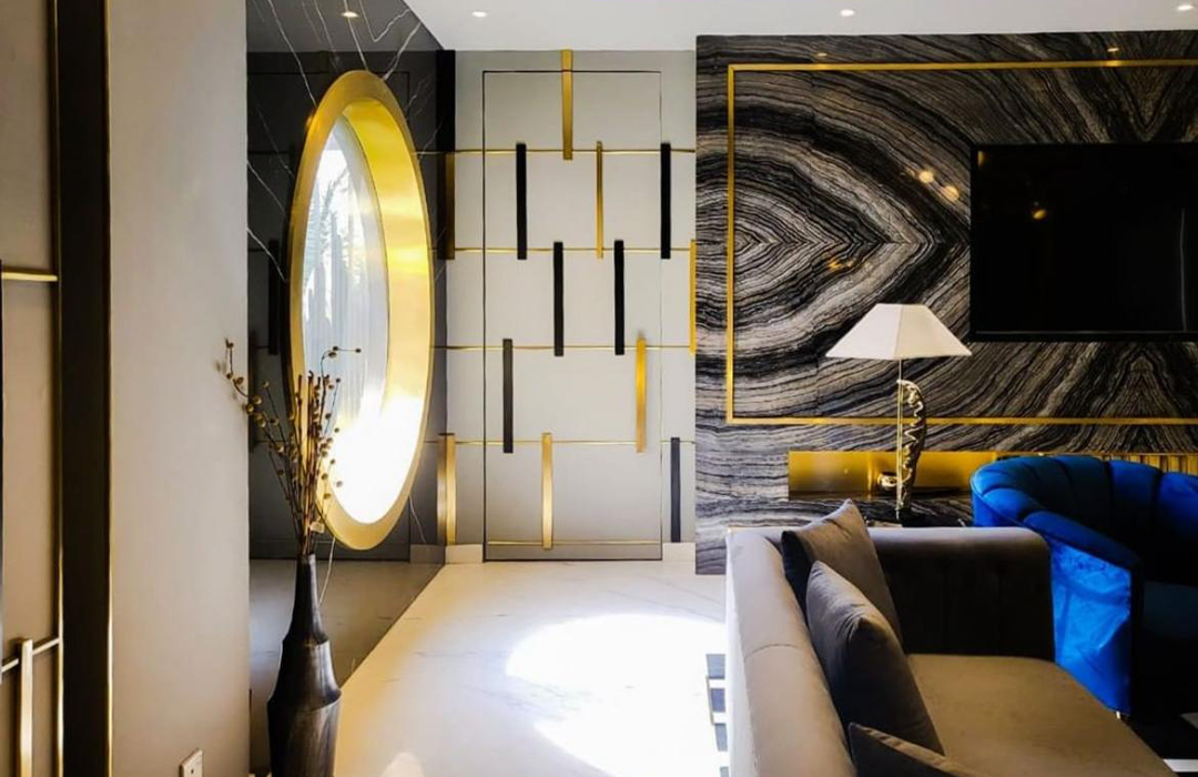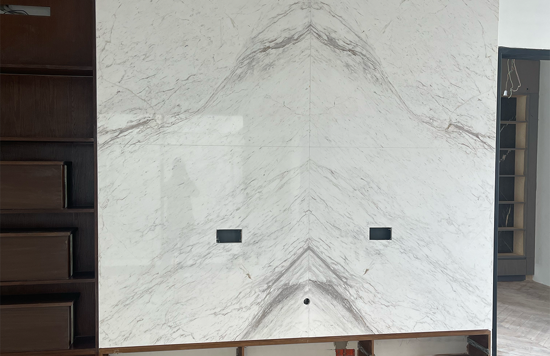 Unveiled the captivating allure of Mezonnite bookmatch in this feature wall, creating a seamless flow of natural stone artistry. The striking patterns redefine luxury, turning the wall into a masterpiece of modern opulence.