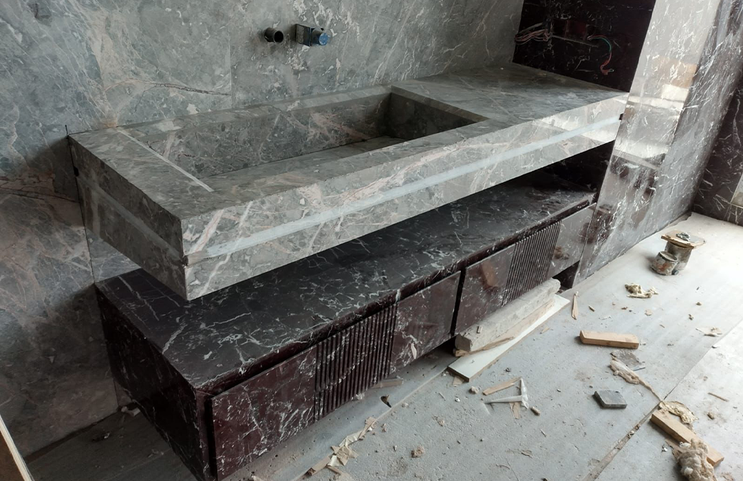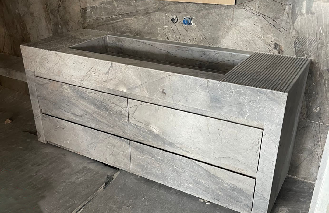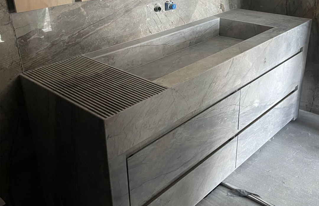 Where marble artistry shines—Cretesol’s “Macchia Vecchia” bookmatched designs blend perfectly with our signature “Nestos marble” surfaces, creating a beautiful and elegant space that feels like a masterpiece.