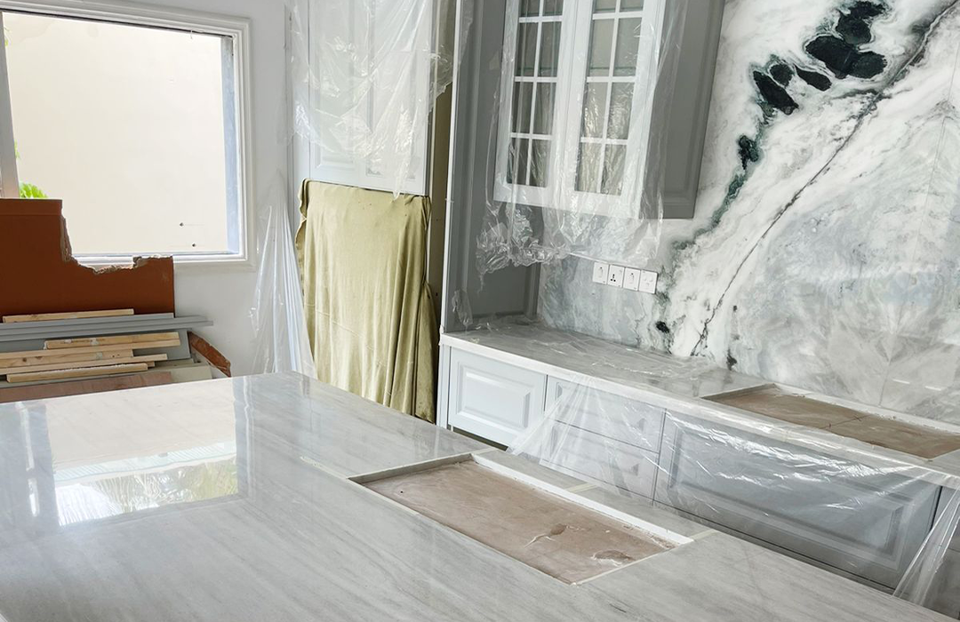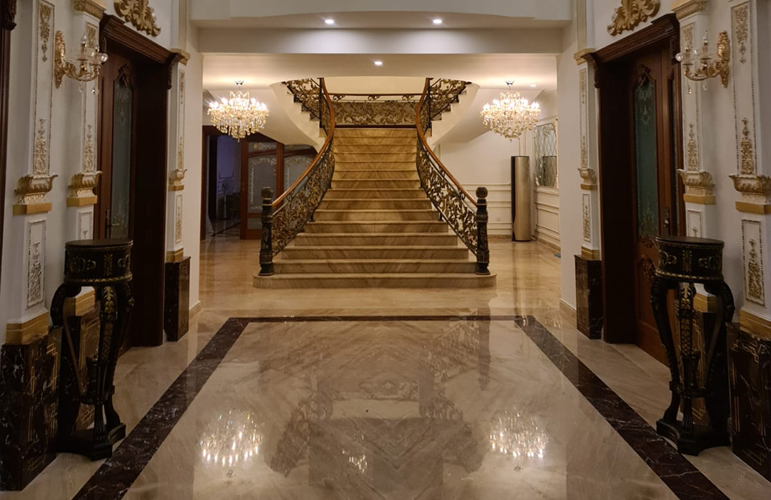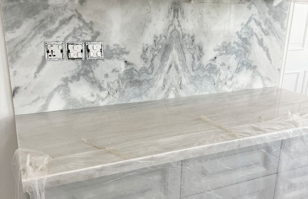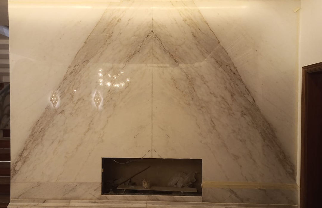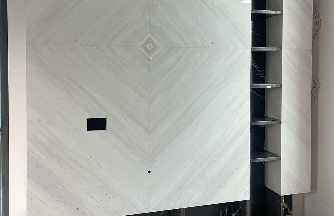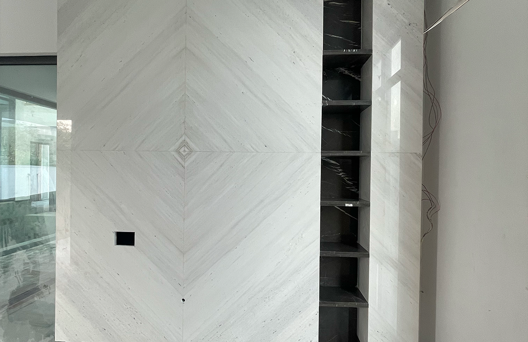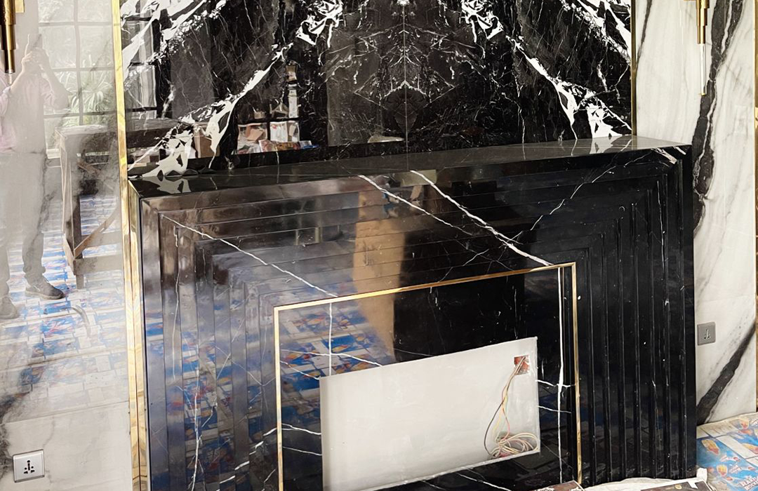 This project features a stunning trio of Cretesol marbles. Panda White graces the sides with its striking contrasts, Nero Marquina brings a bold, mesmerizing presence to the fireplace, and Ice Black crowns the top, creating a sleek and sophisticated finish. Together, these marbles transform the space into a masterpiece of luxury and style.